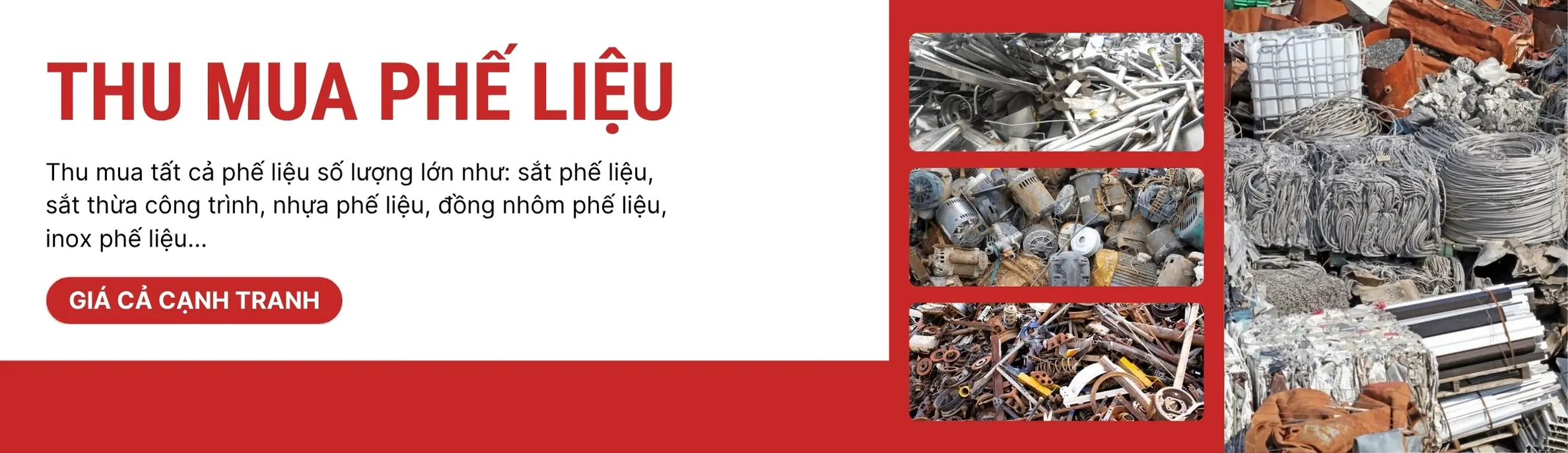 Chúng tôi – Phế Liệu Quang Khải chuyên thu mua đa dạng các loại phế liệu với số lượng từ nhỏ đến lớn tất cả các loại phế liệu sắt, nhôm, đồng, inox, thiếc, máy móc cũ, đồ thanh lý,… với giá cả cạnh tranh và dịch vụ nhanh chóng.